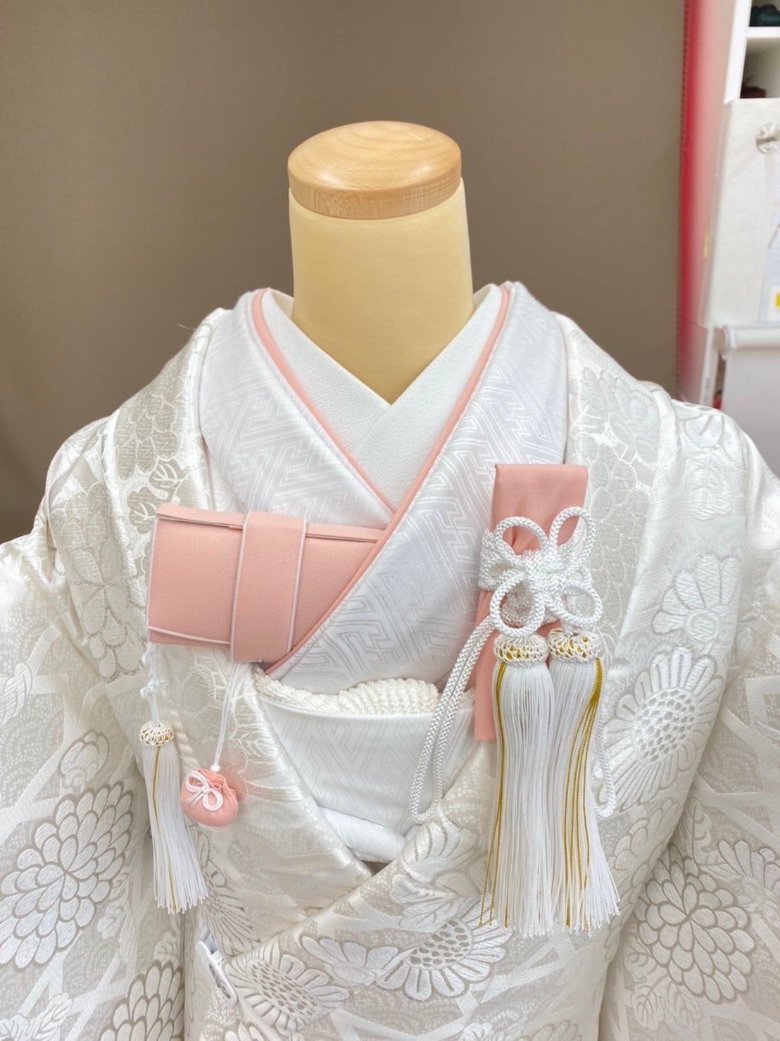 最近では個性的な婚礼5点セットが流行っていますが、お手持ちもしくは、貸衣装屋さんにある既製の丸ぐけや抱え帯、