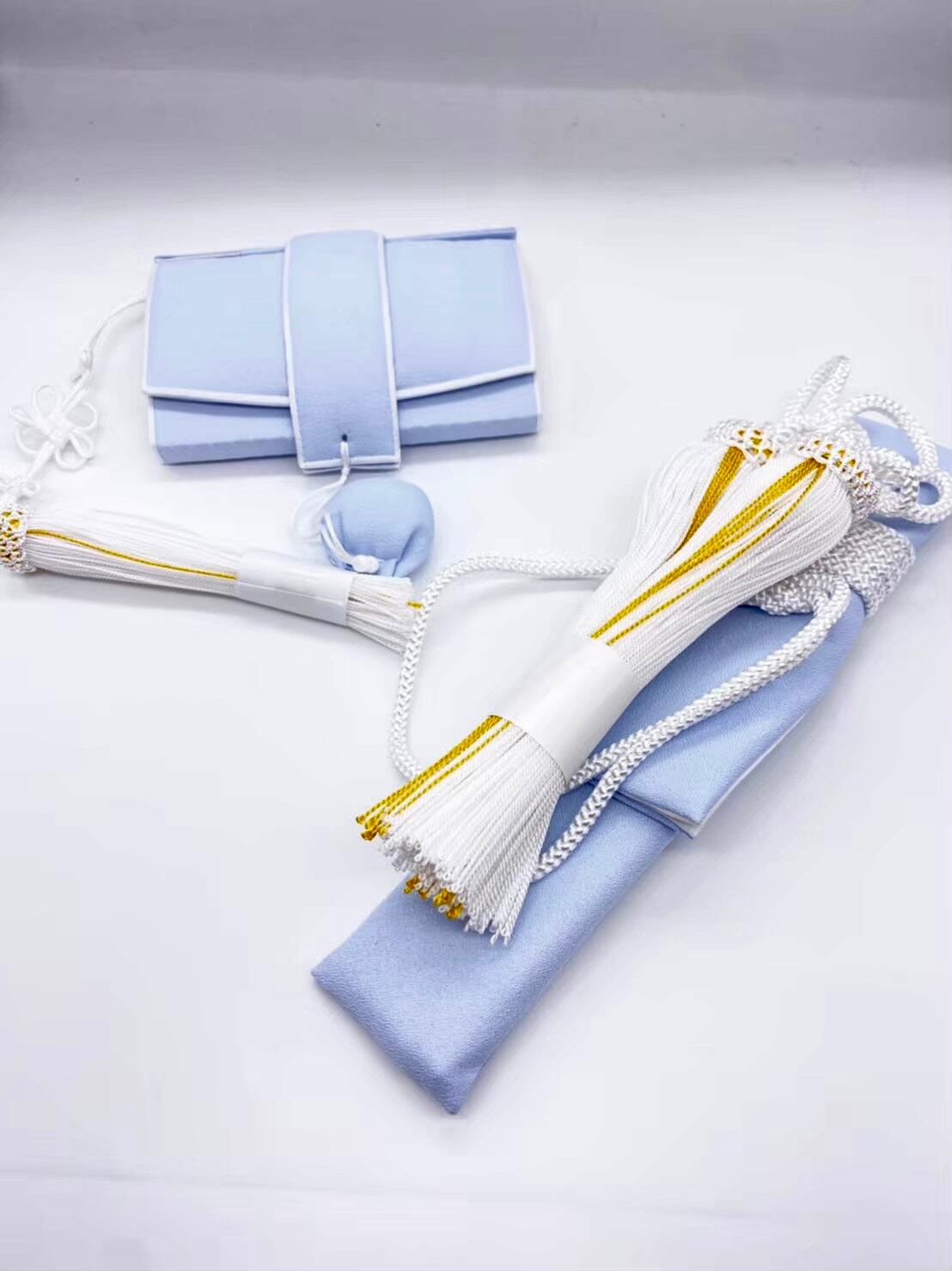 結婚式の花嫁の衣裳に使う新品の筥迫・懐剣と撮影の際便利な差込伊達衿の3点セットです。素材の生地はポリエステル。